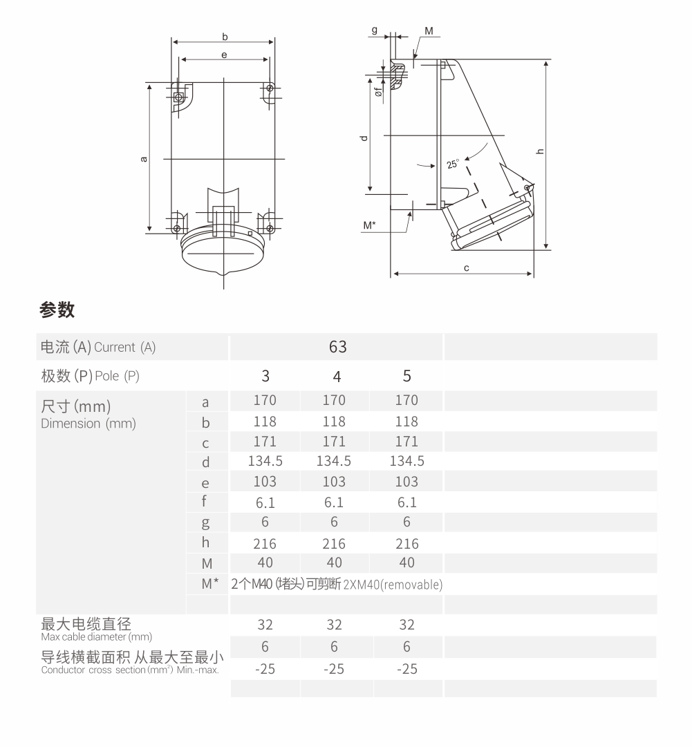 Wall Mounted Socket 63A/3P-128 IP67 230V