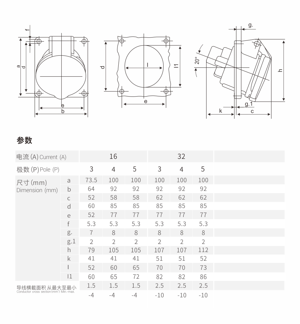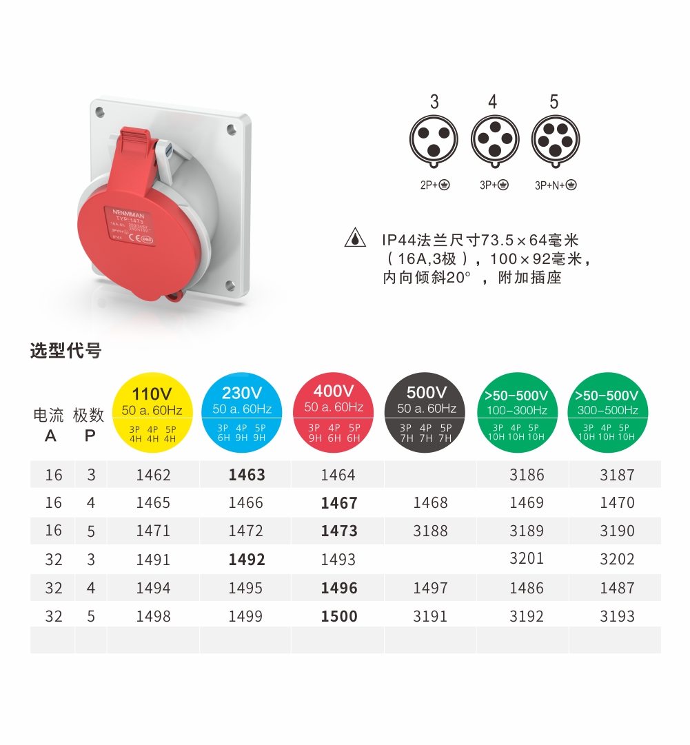 Panel Mounted Socket 16A/5P-1473 IP44 400V Oblique insertion