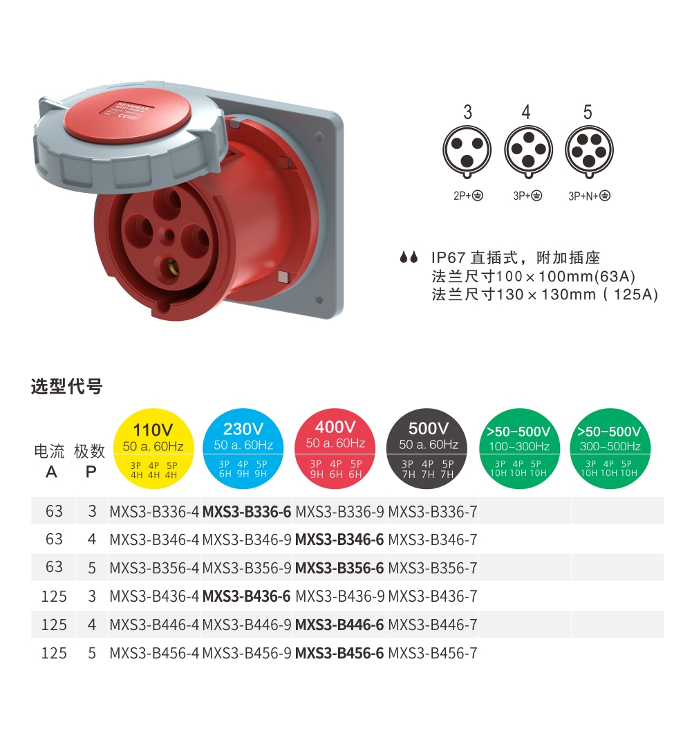 Hexie Series Panel Socket 125A/4P-MXS3-B446-6 IP67 400V