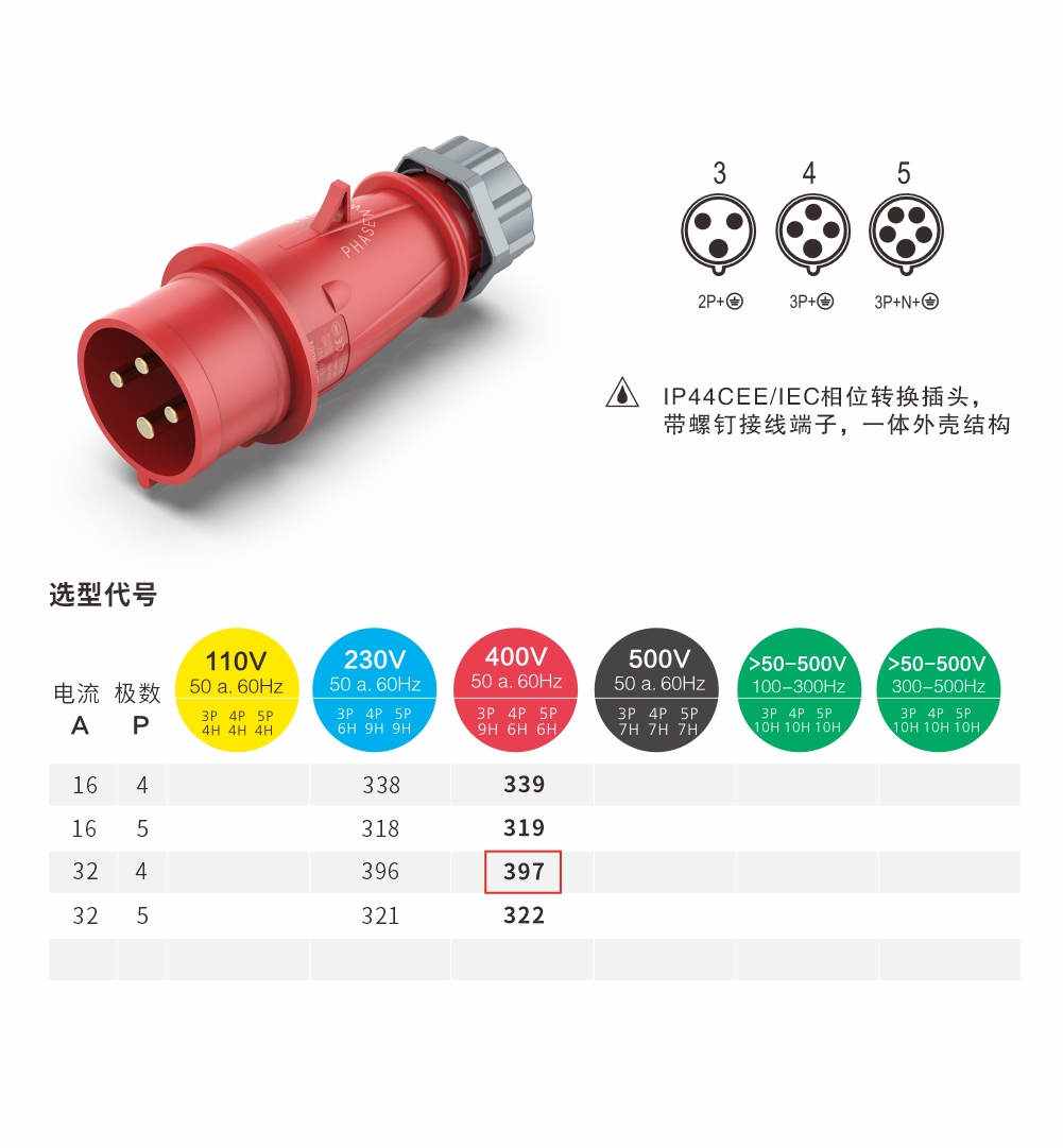 Plug 32A/4P-397 IP44 400V Phase conversion