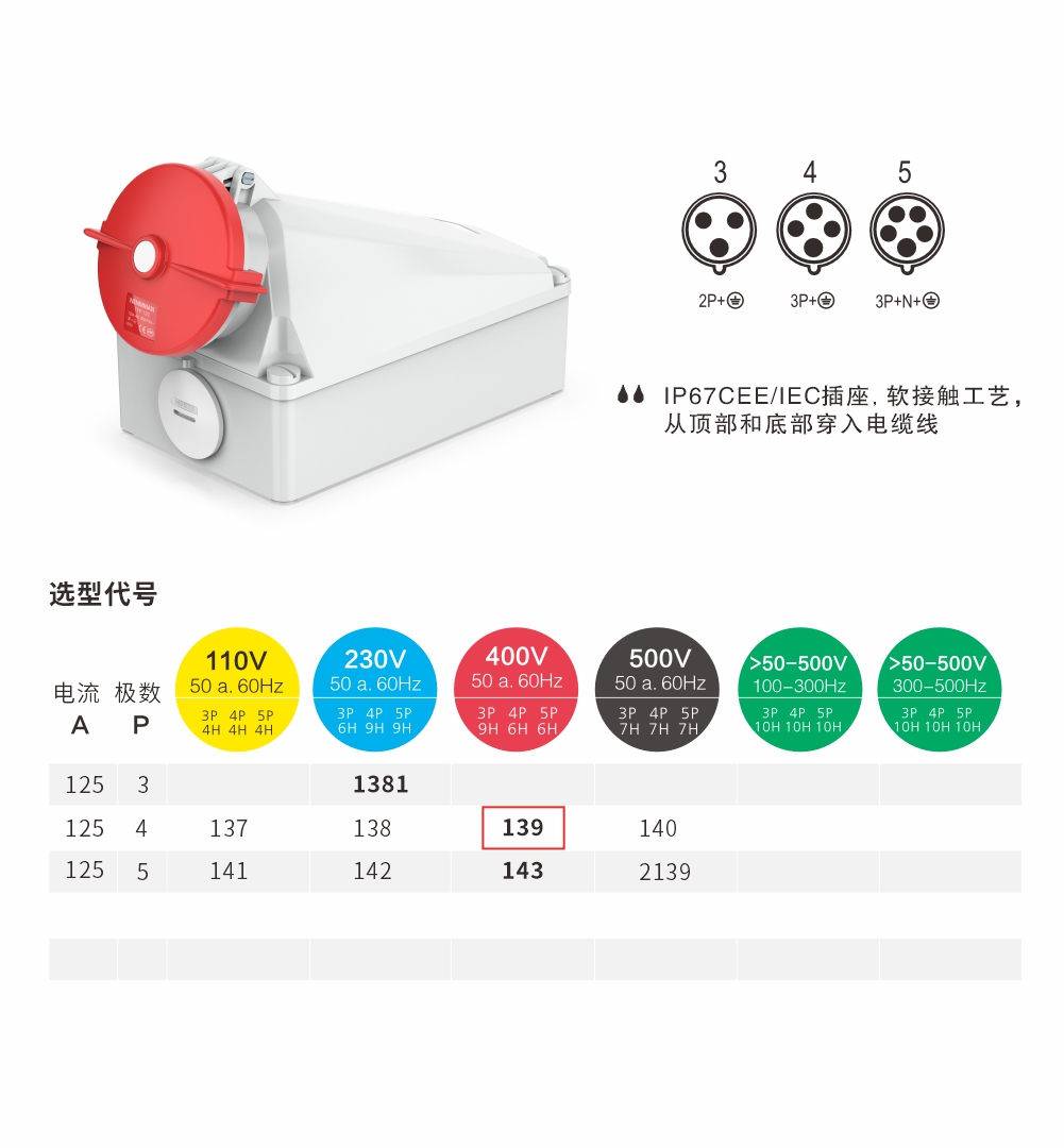 Wall Mounted Socket 125A/4P-139 IP67 400V