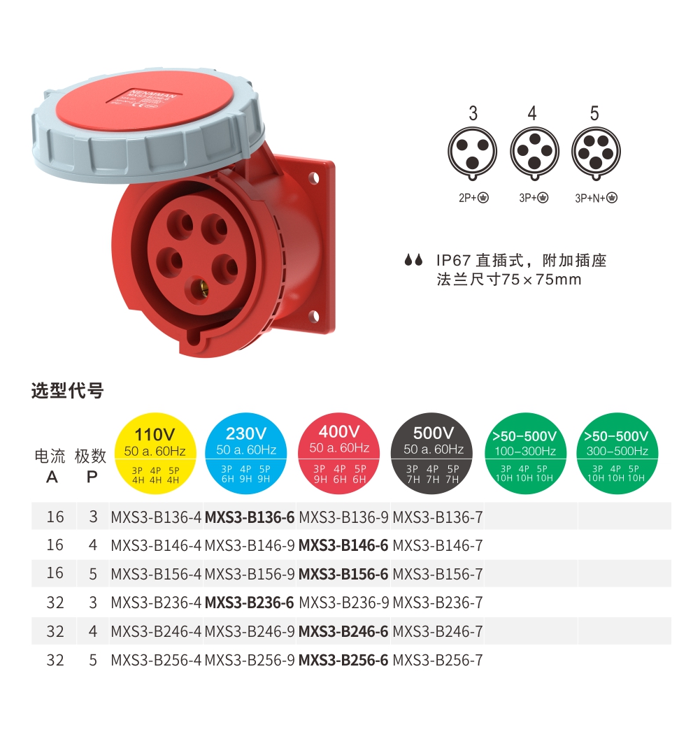 附加插座 32A/5P-MXS3-B256-6 IP67 400V