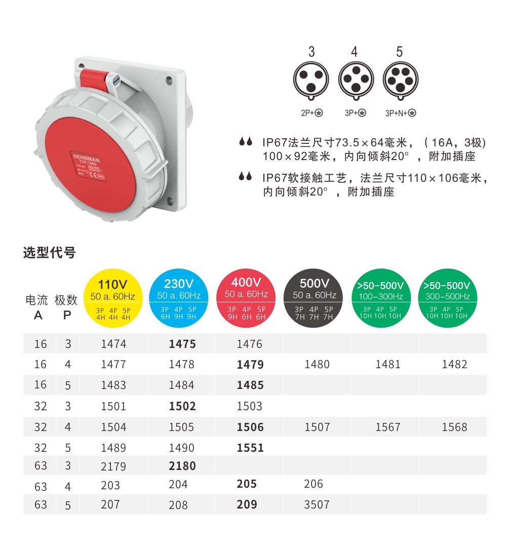 附加插座 16A/5P-1485 IP67 400V 斜插式