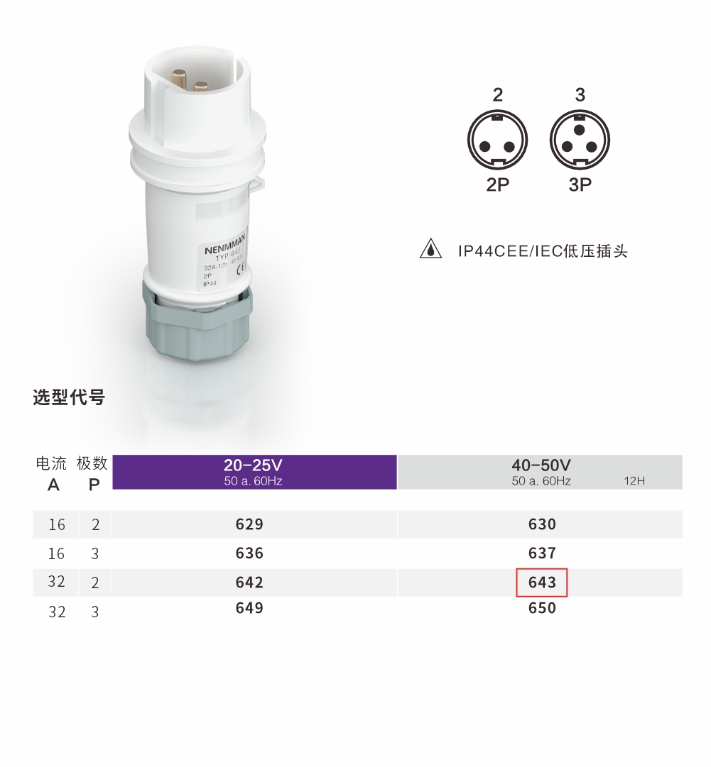 低壓插頭 32A/2P-643 IP44 40V-50V