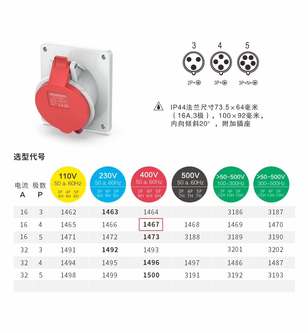 附加插座 16A/4P-1467 IP44 400V 斜插式