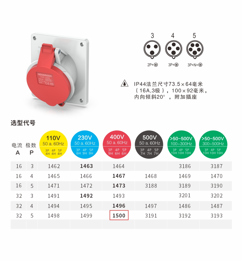 附加插座 32A/5P-1500 IP44 400V 斜插式